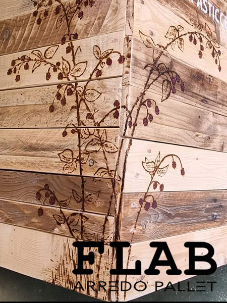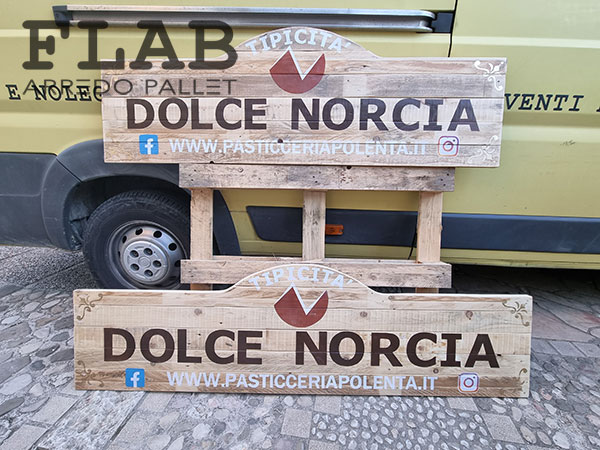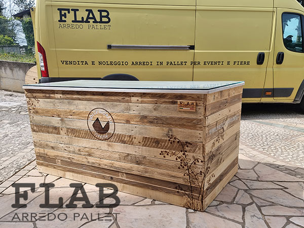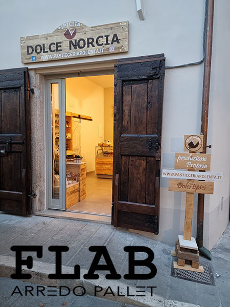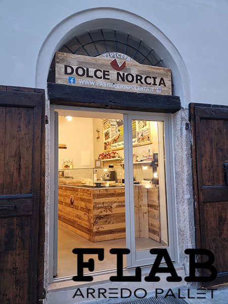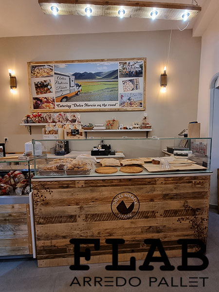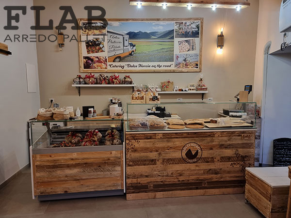 GIUGNO 2016, L’ennesima prova che i pallet possono coesistere con il cibo delicato come i prodotti da macelleria. Utilizzando pallet semi nuovi, diversi i lavori svolti: le lavagne con cornice in pallet, le mensole, il divanetto d’attesa pensato per le persone anziane, il tavolino per i bambini ma sopratutto il bancone degustazioni con forma semi esagonale.